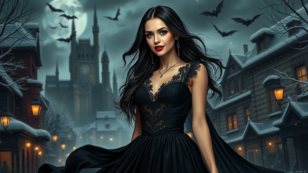 A stunning vampire woman elegantly strolls through a Victorian cityscape blanketed in winter's chill. She exudes an aura of dark allure, with perfectly manicured black fingernails and long, flowing hair framing her detailed, symmetrical face. Her open mouth reveals a captivating smile, and her eyes reflect a mysterious glow, enhanced by meticulous mascara and artful makeup. Dust particles dance in the air, caught in the dramatic chiaroscuro and rim lighting that accentuate her presence. She wears a striking black vampire dress paired with high heels, her silhouette enhanced by a flowing pelvic curtain. A gothic castle looms in the background beneath a night sky filled with bats, stars, and dark clouds. Inspired by the professional, majestic impressionism of Waterhouse and John Constable and the dreamlike qualities of Studio Ghibli, the scene resembles a masterful oil painting by Jeremy Mann, Greg Manchess, and Antonio Moro. The artwork trends on ArtStation and CGSociety, featuring intricate, high-detail elements reminiscent of Makoto Shinkai's Kyoto-inspired works, capturing the essence of both classic and contemporary art forms.