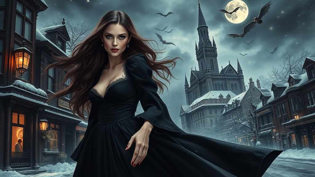 A stunning vampire woman gracefully strides through a Victorian city blanketed in winter, her long hair flowing and her face symmetrical with a captivating open-mouth smile. Her reflective eyes are accentuated by mascara and makeup, while dust particles dance in the detailed lighting. The dramatic chiaroscuro highlights her black vampire dress and high heels, which sweep through the night. In the backdrop, a gothic castle looms under a starry sky with bats fluttering amidst dark clouds. This scene, reminiscent of a professional oil painting by masters like Waterhouse, John Constable, and Jeremy Mann, is trending on ArtStation and CGSociety. The painting captures an intricate and high-detail dramatic scene, infused with the essence of Makoto Shinkai's Kyoto and Studio Ghibli’s whimsical touch.
