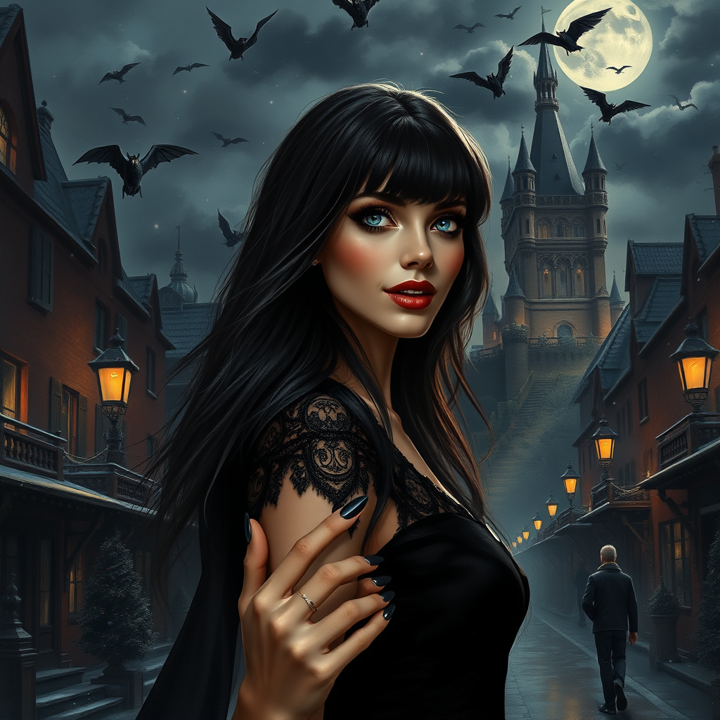 A stunning vampire woman strolls through a Victorian city enveloped in winter, her black manicured nails gleaming against the night. Her long, flowing hair frames a perfectly symmetrical face with stylish bangs and a captivating open-mouth smile. Her reflective eyes, enhanced with mascara and makeup, glisten in the dim light, illuminating the intricate details of her expression. Dust particles dance around her in the dramatic, chiaroscuro lighting that highlights her elegant black vampire dress and high heels. A gothic castle looms in the background under a starry night sky filled with dark clouds and fluttering bats. The scene is reminiscent of a majestic impressionistic oil painting crafted by masters like Waterhouse and Constable, yet infused with the modern touch of artists like Jeremy Mann and Greg Manchess. This masterpiece trends on ArtStation and CGSociety, showcasing intricate, high-detail art. The ambiance echoes the magical realm of Studio Ghibli and the dramatic scenery of Makoto Shinkai's Kyoto. While embodying the surreal allure of a vampire's night, it flawlessly blends classic beauty with an enigmatic, gothic charm.
