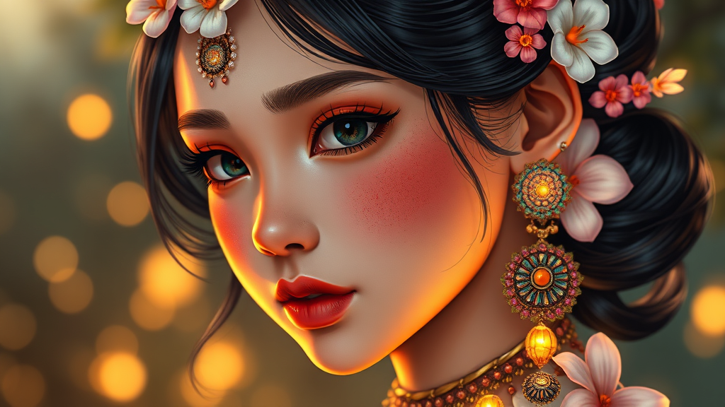 A stunning vision of a Javanese-inspired girl with exquisite jewelry, her freckled complexion accentuated by glowing fireflies woven into her hair. Her attire is adorned with flowers, and her character art style is reminiscent of the works of Artgerm, WLOP, and Ilya Kuvshinov, as seen on trending platforms like ArtStation. This digital artwork captures the essence of Chanel and Dior with influences from artists like Daniel F Gerhartz, Akihiko Yoshida, Anna Dittmann, Tetsuya Nomura, and Tom Bagshaw. The illustration is a vibrant and colorful ink creation with symmetrical facial features and precise anatomy. The composition is enveloped in soft, warm lighting, meticulously hyper-detailed with sharp focus, intricate design elements, and a dreamy bokeh background. The image is rendered in UHD, HDR10, and 16K resolution, delivering an ultra-high definition visual experience.