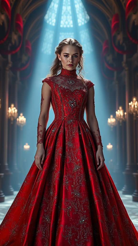 A stunning vision of Anya Taylor-Joy adorned in a breathtaking red gown crafted with shimmering rubies and sparkling diamonds, featuring intricate detailing throughout. The fashion dress, made from soft silk, boasts a textured brocade pattern, perfect for a high-fashion show setting. Her radiant beauty is accentuated against the backdrop of a Sci-fi Victorian great hall, adding an ethereal essence to the scene. The turtleneck dress elegantly flows, reminiscent of a bridal gown designed for wedding photography, enveloping her in a full-body silhouette. The composition is symmetrical, captured with octane rendering for ultra-realistic cinematic lighting. The influence of Peter Mohrbacher is evident in the level of detail and artistry, creating a spectacular visual narrative.