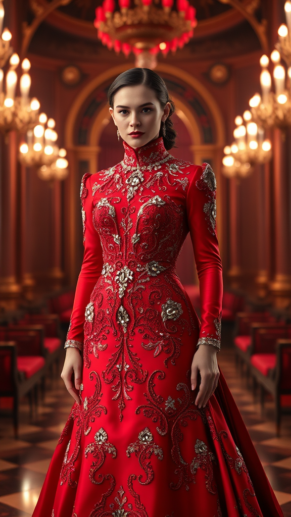 A stunning vision of elegance, Anya Taylor-Joy in a magnificent red gown crafted from rubies and glistening diamonds, adorned with intricate details. The fashion piece, made of soft silk and textured brocade, exudes a sense of absolute luxury. Set in a Sci-fi Victorian great hall, the ambiance is both futuristic and classic. The turtleneck design of the dress adds a touch of sophistication, suitable for a grand fashion show or lavish wedding photography. Her beauty is highlighted by the ultra-realistic, cinematic lighting of the scene. Styled in symmetry, the full-body gown captures the grandeur of a bridal masterpiece. The scene resonates with the artistic influence of Peter Mohrbacher, blending a poetic vision with an octane render that brings out the meticulously detailed craftsmanship of the dress.