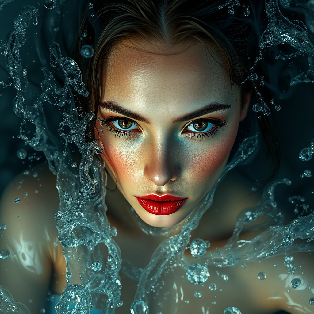 A stunning water-formed woman, beautifully crafted with a touch of fantasy art, featuring realistic and hyper-detailed features, such as photo-realistic eyes amidst splashing water. Enveloped in enigmatic lighting, she appears in 8k resolution with UHD and HDR quality. Inspired by the essence of Dark Sushi 25D, the artwork is free of any duplications or disfigurements, ensuring no mutations or deformities. The scene is clear, without cloned faces or cross-eyed attributes, maintaining natural proportions without extra limbs. The composition remains sharp and within frame, free from blurriness or distortion like jpeg artifacts. It's devoid of any watermarks, logos, or text, with a cohesive single image free of cartoonish elements or split visuals.