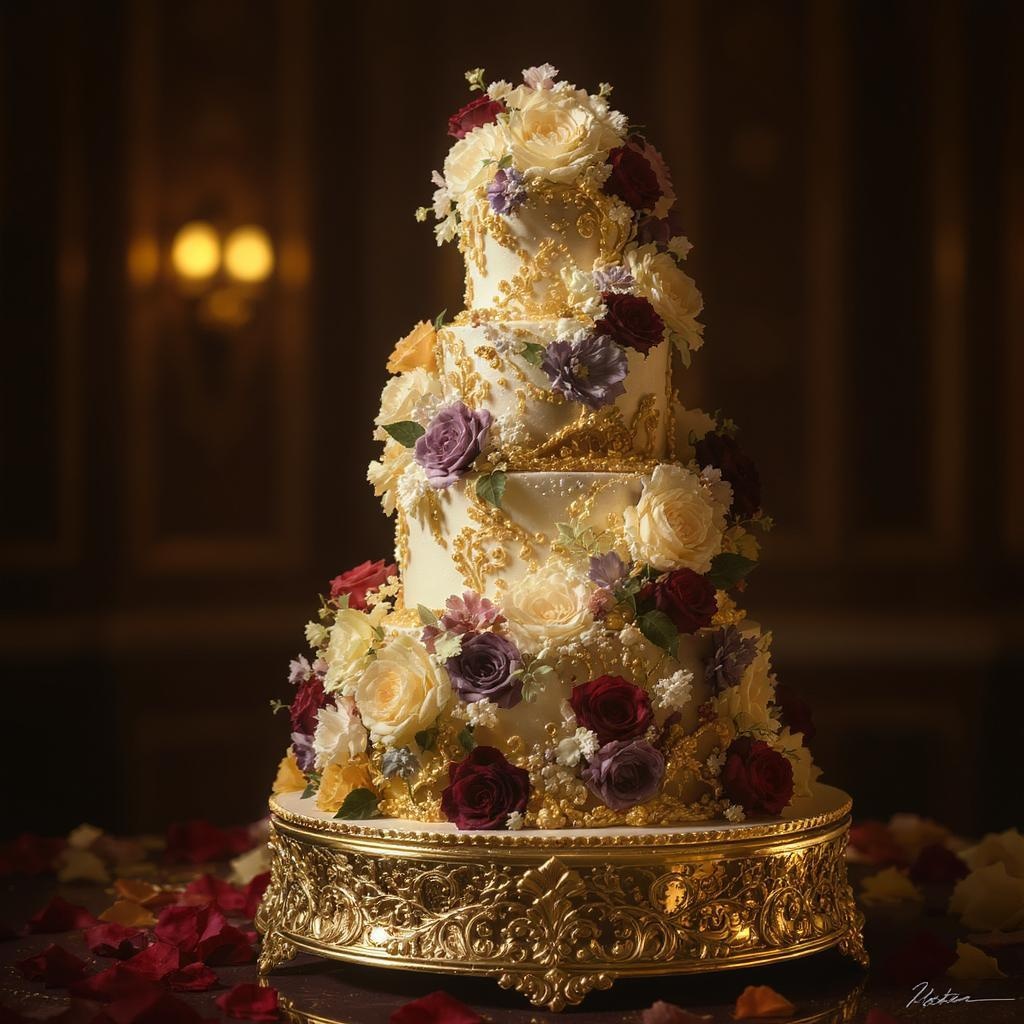 A stunning wedding cake that transforms into a mesmerizing sculpture, featuring intricate decorations with elegant flourishes. Edible flowers cascade gracefully, adding to the opulence. The digital art captures photorealistic details in high contrast, with soft shadows enhancing the three-quarter view. Detailed textures invite a closer look, while rich colors and depth of field create a sense of depth. Ambient lighting bathes the scene in a warm glow, evoking sophistication and charm.
