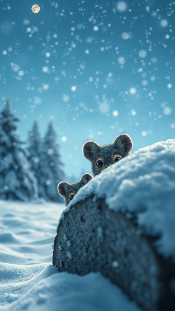 A stunning winter wonderland unfolds under a clear, starry sky, each snowflake meticulously rendered in an 8k resolution. The scene is ethereal, with a gentle snowfall blanketing the landscape, the snow shimmering under the soft, cinematic lighting. In the foreground, a pair of adorable woodland creatures with large, expressive eyes peer out from behind a snow-covered log, their fur perfectly detailed and catching the subtle glow of the moonlight. The 50mm lens captures the depth and intimacy of this enchanting moment, while the octane render enhances the crispness and realism, bringing to life the magic of a silent, snowy night.