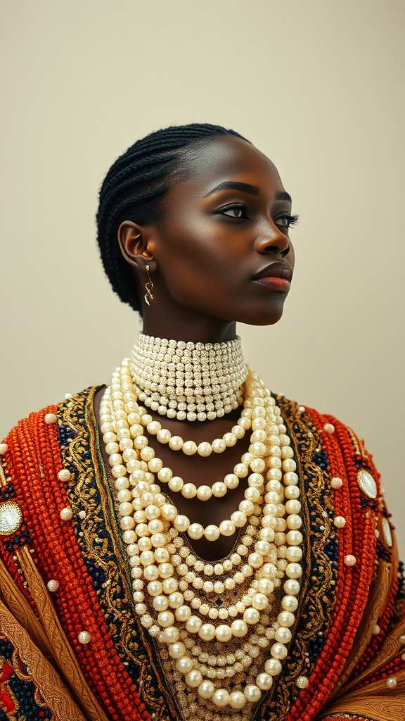 A stunning woman adorned in a beaded shawl and a delicate pearl necklace, capturing the essence of Ororo Munroe in an afrofuturism style, with influences of pearls and the elegance of Maria Borges. She exudes the aura of a beautiful pearl queen, with cascading strings of pearls interwoven into her attire. Her dress, a masterpiece made of intricate beads, reflects the visionary aesthetics of Carrie Mae Weems and Gordon Parks. This portrait, echoing the vibrant spirit of a black woman, channels the artistry of Lily Delissa Joseph and embodies the richness and depth of afrofuture elegance.
