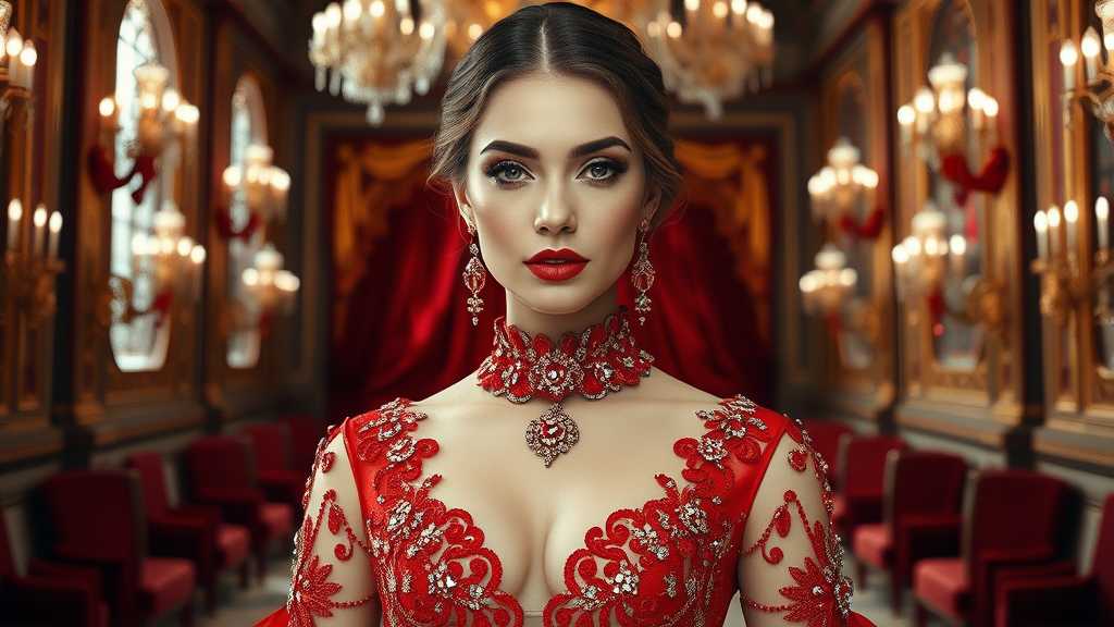 A stunning woman adorned in a luxurious red gown encrusted with shimmering rubies and glistening diamonds, featuring intricate detailing, delicate silk, and exquisite brocade, showcased in a fashion show setting. Her captivating beauty is framed within a Sci-fi Victorian great hall, her gown a seamless blend of turtleneck elegance and bridal sophistication, captured with wedding photography expertise. The full-body image emphasizes symmetry and ultra-realism, reminiscent of Peter Mohrbacher's artistic style, with a focus on cinematic lighting. Rendered in breathtaking detail, the scene is presented in both 8k and 4k resolution.