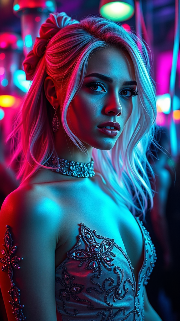 A stunning woman adorned in elegant party attire, boasting silver-pink hair that shimmers under the vibrant neon lights of a cyberpunk-themed celebration. Her appearance is captured with hyperrealism, emphasizing the rich textures and intricate details of her ensemble. The scene is alive with the dynamic reflections of colorful party lights, creating an immersive atmosphere. The photorealistic quality ensures every aspect is sharp and vivid, set in a vertical aspect ratio that enhances the grandeur of the moment, with an added element of artistic flair to suggest a captivating narrative.
