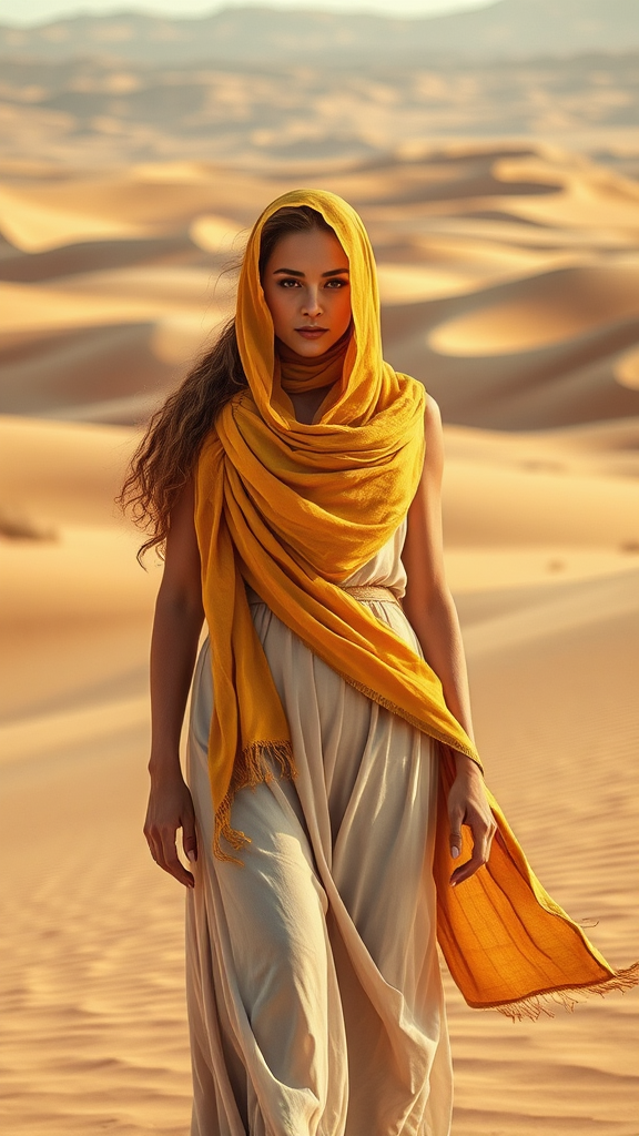 A stunning woman adorned with a flowing yellow scarf stands gracefully amidst an expansive desert landscape, evoking the essence of a biblical drama. Her surroundings are bathed in light brown and amber hues, imbued with a cinematic quality reminiscent of Alan Lee's artistry. The scene is enhanced by sweeping dune formations that create a mesmerizing desertwave effect. The entire composition feels strikingly beautiful and epic, as if captured by the lens of David Plowden, inviting viewers to lose themselves in its timeless allure.