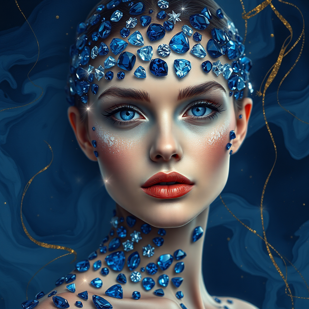 A stunning woman adorned with a mesmerizing pattern of sapphire crystals, these crystals shimmer like precious gems around her eyes, catching light in dazzling facets. Additional crystals surround her like floating stars. Her skin emits an ethereal glow, reminiscent of moonlight on a clear night. The background is an abstract setting in deep shades of blue, featuring fluid shapes and subtle golden details that dance like threads of gold among gentle shadows. The image is in high resolution, showcasing intricate details in the textures of both the crystals and her skin. Soft lighting accentuates the delicacy, blending natural beauty with an enchanting touch of surrealism.