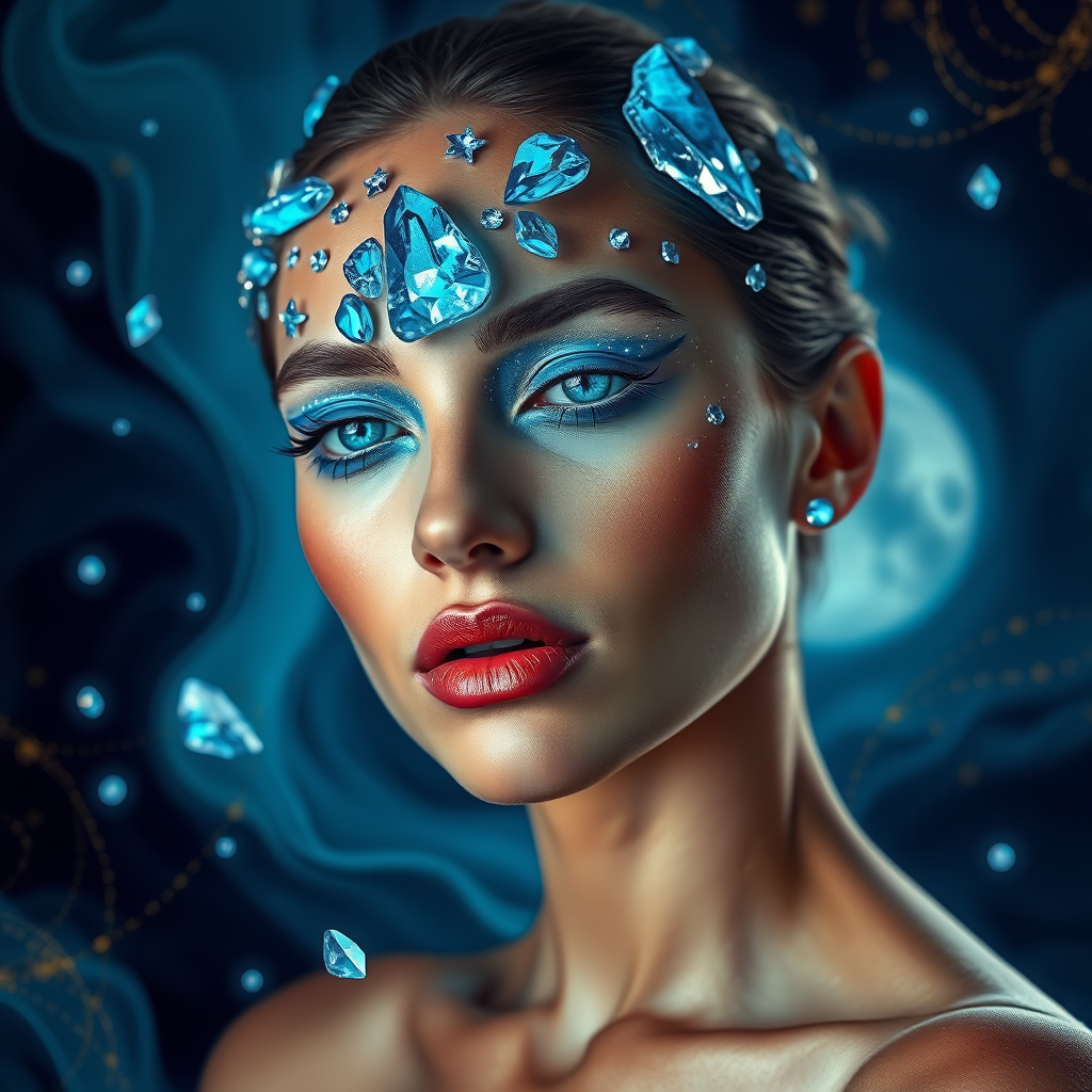 A stunning woman adorned with makeup crafted from sparkling blue crystals, these gems shimmer like jewels around her eyes, casting light in bright facets, while others drift around her like floating stars. Her skin emits an ethereal glow, reminiscent of moonlight on a clear night. The background is an abstract setting in deep blue hues, with fluid shapes and subtle, golden details weaving like threads of gold among gentle shadows. A high-resolution photograph captures intricate details in the textures of the crystals and her skin, with soft lighting that enhances delicacy, in a hyper-realistic style blending natural beauty with enchanting surrealism.