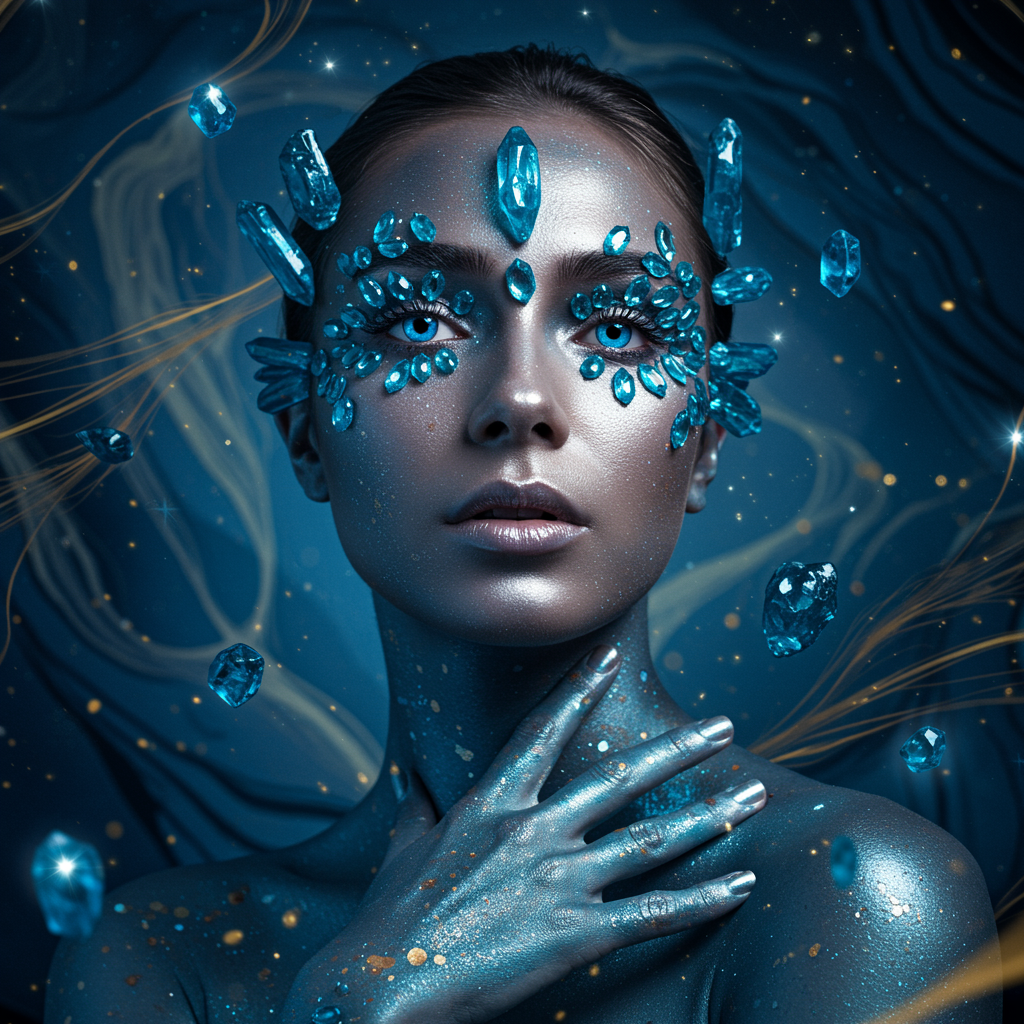 A stunning woman adorned with makeup crafted from shimmering blue crystals, each crystal sparkling like gemstones in her eyes, reflecting light in dazzling facets, while others hover around her like floating stars. Her skin exudes an ethereal radiance, reminiscent of moonlight on a clear night. The background features an abstract environment in deep shades of blue, with fluid shapes and subtle golden details that weave like threads of gold amongst gentle shadows. This high-resolution photograph captures intricate details in the textures of the crystals and her skin, with soft lighting enhancing the delicacy in a hyper-realistic style that blends natural beauty with enchanting surrealism.