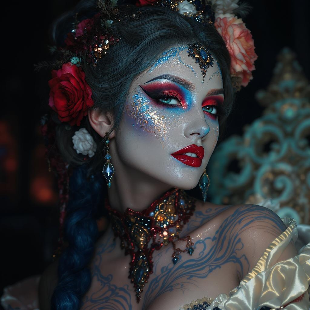 A stunning woman adorned with rich red, cerulean blue, and shimmering gold makeup, reminiscent of enchanting Venetian landscapes, hyperrealistic in detail, with an infusion of dark teal and pristine white hues. The style exudes an aurorapunk vibe, capturing the mystique and elegance of gilded sculptures against a softly glowing background, with delicate patterns inspired by the ethereal play of light in a dreamlike atmosphere.