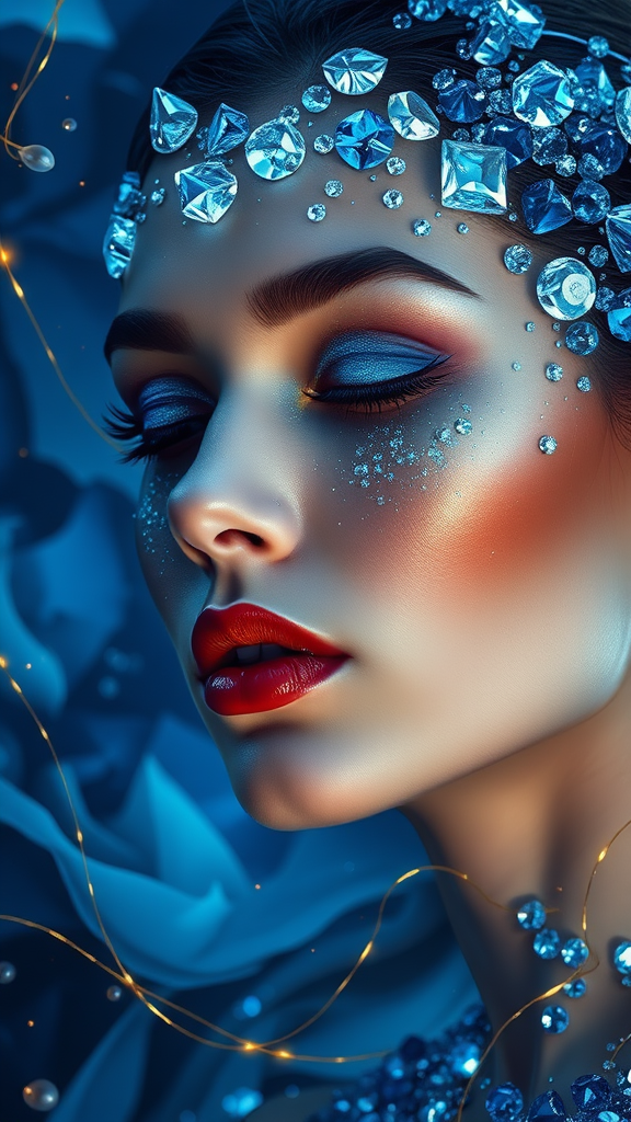 A stunning woman adorned with shimmering blue crystal makeup, the crystals glinting like jewels around her eyes, casting sparkling reflections as others float around her like celestial stars. Her skin emits an ethereal glow, reminiscent of moonlight on a clear night. The background is an abstract scene in deep blue hues, with fluid shapes and subtle golden details weaving through, dancing like threads of gold among gentle shadows. The high-resolution photograph captures the intricate textures of the crystals and her skin, with soft lighting enhancing the delicacy. It presents a hyper-realistic style blending natural beauty with enchanting surrealism, offering a mesmerizing vision of otherworldly elegance.