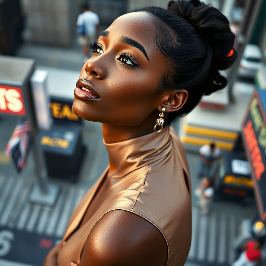 A stunning woman, captured as a masterpiece with high quality, is viewed in full body from a high angle. Her sophisticated pose accentuates a complex form, with a closed posture and eyes gazing upwards, showcasing extremely detailed features and face. She has captivating big brown eyes and radiant dark skin, set against the backdrop of a lively city. Shot on a Nikon d850 with a f1.6 lens using Kodak Portra 400 film, the image boasts rich, vivid colors and an incredibly realistic texture.