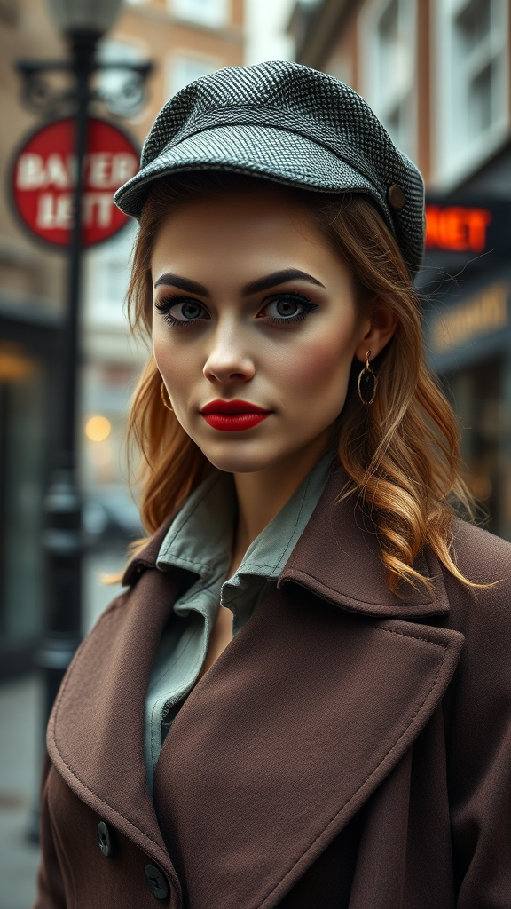 A stunning woman clad in a classic Sherlock Holmes ensemble stands confidently on Baker Street, London. Her allure is unmistakable as she locks eyes with the viewer, exuding a playful charm. Captured in a portrait-style photograph, her skin boasts exquisite detail, contributing to a photo-realistic quality enhanced by 8k resolution. The scene presents a full-length view, showcasing her attire with high detail and raw color artistry. Piercings and diffused soft lighting add character, while a shallow depth of field and sharp focus lend to the hyperrealism. Cinematic CGI-style lighting accentuates the setting. The woman is impeccably proportioned with realistic anatomy, avoiding any distortions or errors that diminish quality. There's no interference from artifacts like text, watermarks, or signatures, ensuring the image remains pristine and entirely focused on the captivating subject.