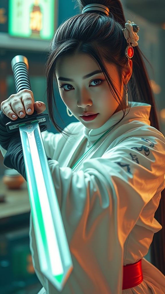 A stunning woman clad in futuristic attire grips a sword with precision, captured in the style of a cinematic snapshot with hyper-realistic detail. Her appearance is illuminated by soft light green and white hues, akin to the vibrant depth of fujifilm eterna vivid 500t. Blending chinapunk and cyberpunk realism, her surroundings reflect a fusion of tradition and advanced technology. The environment carries a serene yet edgy poolcore aesthetic, with water reflections adding a dynamic element to the scene's intricate composition.