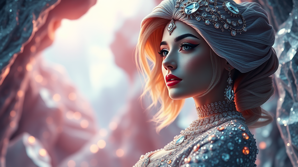 A stunning woman crafted from shimmering diamond and silk, adorned with gems and sparkling dots, set against a crystal cave backdrop in the style of Darek Zabrocki. The scene exudes magic realism with gradient colors and cinematic lighting, enhanced by bokeh effects. Featuring ultra-detailed quality 3D design, rendered with octane in Unreal Engine. The composition is isometric and created in Blender, offering an 8k ultrahd cinematic wallpaper experience with a focus on depth and dimension. The woman appears as an ethereal figure, embodying elegance and mystery in this enchanting environment.