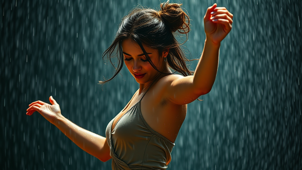 A stunning woman dances gracefully in the pouring rain, her face and body glistening with raindrops as her hair, styled in a messy bun, cascades down slightly. The scene captures the essence of movement and emotion in 32k UHD, highlighting the intricate details of every droplet and strand of hair. The atmosphere around her is filled with a sense of freedom and wild beauty, as the rain creates a shimmering curtain that enhances the vivid details of her expression and form.