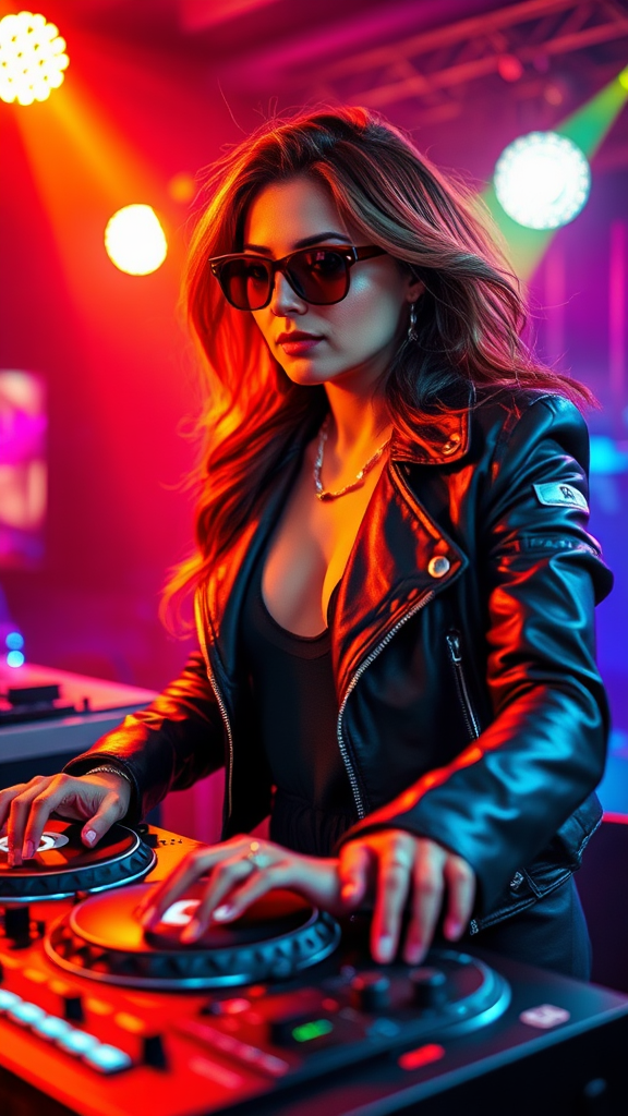A stunning woman DJ wearing stylish sunglasses and a cool leather jacket, energetically deejaying with turntables and dancing under vibrant, colorful disco lights. The scene is composed with elements of the rule of thirds and golden ratio, creating a cinematic and high-resolution feel. Her presence is confident and captivating, surrounded by an electrifying atmosphere, while showcasing her musical prowess with finesse and charm.