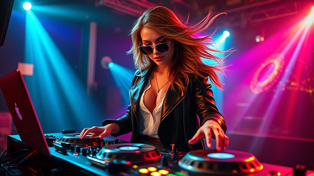 A stunning woman DJ with flowing hair, wearing stylish sunglasses and a sleek leather jacket, skillfully mixes tracks on turntables while moving energetically to the beat. The scene is illuminated by vibrant, colorful disco lights that dance across the room, enhancing the lively atmosphere. The composition follows the rule of thirds and golden ratio, creating a visually pleasing and cinematic effect. The image captures the DJ's confidence and passion, highlighting her immersive connection to the music and her audience.