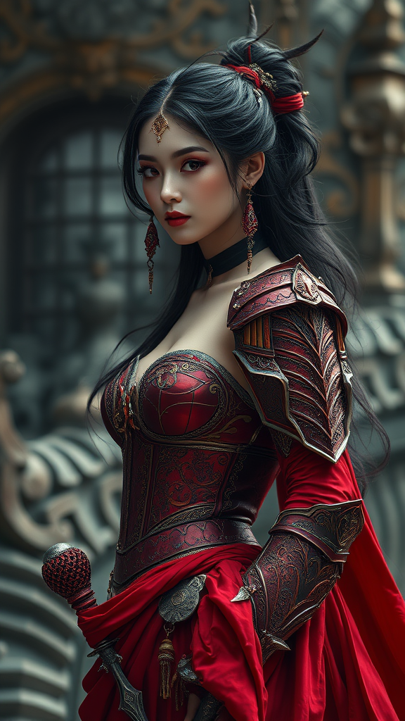 A stunning woman draped in a crimson corset and flowing scarlet gown, she embodies a captivating fusion of culture and fantasy. Inspired by the intricate elegance of Karol Bak, Alena Aenami, and Artgerm, her presence is both ethereal and commanding. Her form is highlighted by hyperrealistic fantasy elements, with textures that reflect an 8k high-quality artistry, capturing every intricate detail of her attire and visage. Her armor, subtle yet regal, gleams like freshly polished red steel, echoing the style of Julie Bell and Beeple, enhancing her mystique as a warrior goddess. She stands as a masterpiece of realistic fantasy art, embodying strength and beauty in perfect harmony.