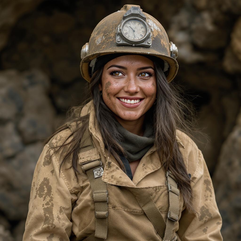 A stunning woman dressed as a miner, her skin and clothes marked by dirt, exudes charm and confidence with an alluring smile, engaging the viewer with a playful glint in her eye. This highly detailed, photo-realistic portrait captures her in a full-length frame with sharp focus and 8k precision. Her intricate features are illuminated by diffused soft lighting and cinematic tones, creating a hyperreal visual experience. Despite the mining attire, her natural beauty shines through, drawing attention to a subtle piercing that adds to her captivating allure. The composition showcases her personality and strength, encapsulated in realistic textures and lifelike anatomy.