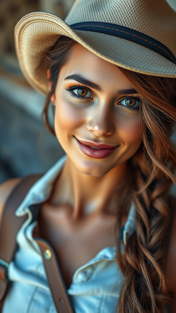 A stunning woman dressed as a modern-day explorer with a hint of adventure, engaging and playful as she makes eye contact with the viewer. In a beautiful portrait setting, her skin is detailed and realistic, capturing the essence of photo-realism with vibrant colors and a soft diffused light. The photography features a full-length frame with high-resolution quality, showcasing hyper-realistic details and cinematic CGI lighting. The focus is sharp and the depth of field is artfully shallow, bringing authenticity and charm to the image, highlighting her attractive features and adventurous spirit.