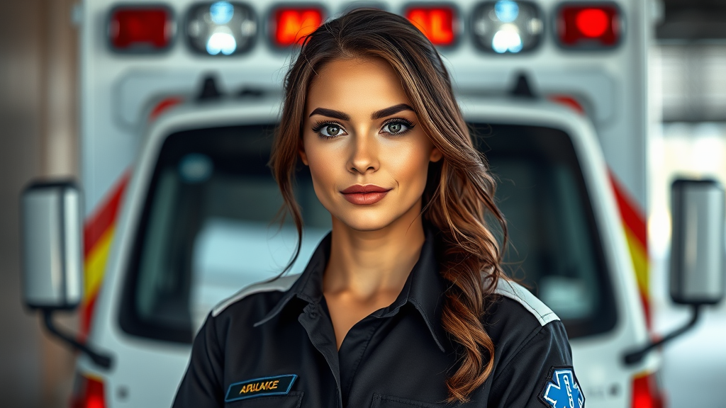 A stunning woman dressed as a paramedic stands with an ambulance in the backdrop, exuding confidence and charm while making eye contact with the viewer. The portrait, captured in a photo-realistic style with detailed skin, showcases her beauty. The photography features an 8k resolution with a full-length frame, utilizing high-detail RAW color art and cinematic lighting. The image is brought to life with diffused soft lighting and a shallow depth of field for a striking sharp focus, embodying hyperrealism. Elements are perfectly composed without errors or distractions, ensuring authenticity and captivating visual appeal.