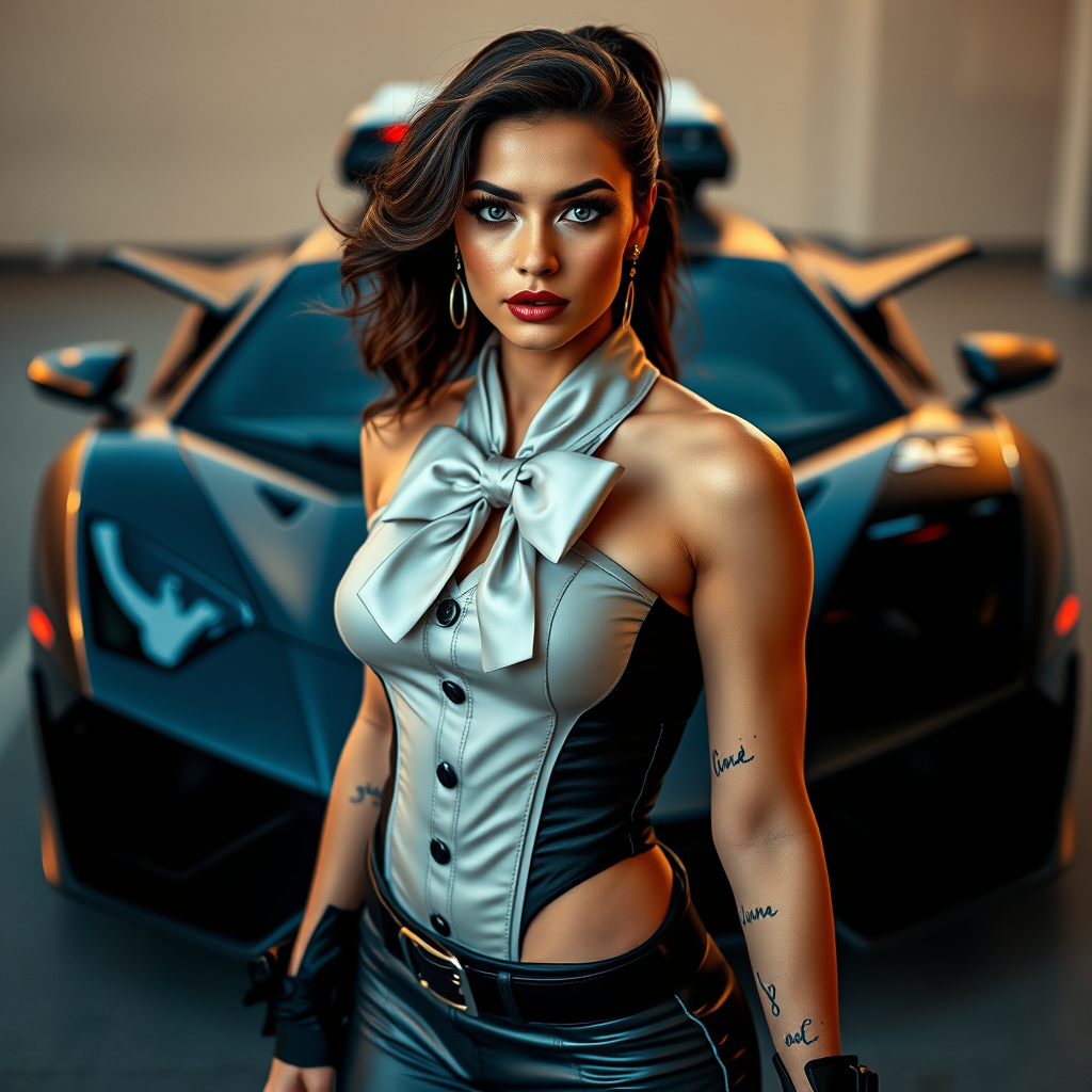 A stunning woman dressed in a chic, futuristic Ghostbuster-inspired outfit with a playful bow stands confidently, exuding charm and allure. Her captivating gaze locks onto the viewer, as the sleek Lamborghini, modified to an avant-garde Ghostbusters car, sits impressively in the background. The scene captures a mesmerizing blend of elegance and adventure, with her detailed skin and piercing completing the striking look. Shot in 8k high detail, the photograph showcases a masterful mix of diffused soft lighting and cinematic tones, creating a hyper-realistic, full-length portrait. The use of shallow depth of field and sharp focus highlights her sophisticated presence against the backdrop, making for a breathtaking piece of RAW color art.