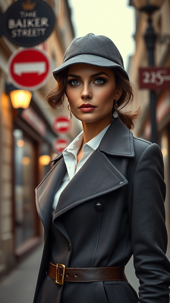 A stunning woman dressed in a classic Sherlock Holmes-inspired outfit stands confidently on Baker Street in London. She exudes charm and allure, her eyes playfully engaging with the viewer. This portrait captures the subject in extraordinary detail, showcasing realistic skin textures and a photo-realistic finish in a full-length frame. The scene is brought to life with high detail raw color art, utilizing diffused soft lighting, shallow depth of field, and sharp focus for a hyperrealistic, cinematic CGI feel.