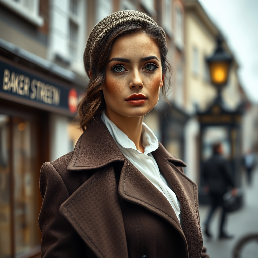 A stunning woman dressed in a Sherlock Holmes-inspired outfit stands confidently on Baker Street, London. Her gaze is captivating and slightly flirtatious as she looks directly at the viewer. This portrait captures the essence of realism with detailed skin tones in a photo-realistic 8k composition. Full-length framing showcases her elegant attire with high detail using RAW color art, enhanced by cinematic, diffused soft lighting. The shallow depth of field and sharp focus highlight her features, adding to a hyperrealistic effect reminiscent of a cinematic CGI. The scene is free of any distortions or artifacts, presenting an image of impeccable quality and lifelike proportions.