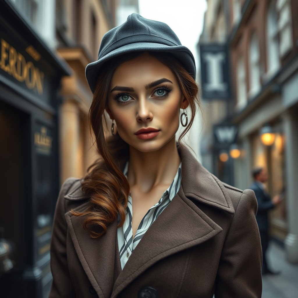 A stunning woman dressed in a stylish Sherlock Holmes-inspired outfit stands gracefully on Baker Street in London. Her attractive gaze locks flirtatiously with the viewer in this captivating portrait. The photography captures her in remarkable detail; her realistic skin texture, sharp focus, and high-quality resolution bring her to life in an 8k, hyper-realistic, full-length frame. The atmosphere is enhanced by diffused soft lighting and a shallow depth of field, lending a cinematic and CGI-like feel. With natural anatomy and proportions, every detail from her piercing eyes to her elegant posture is meticulously depicted, avoiding any errors or distortions.