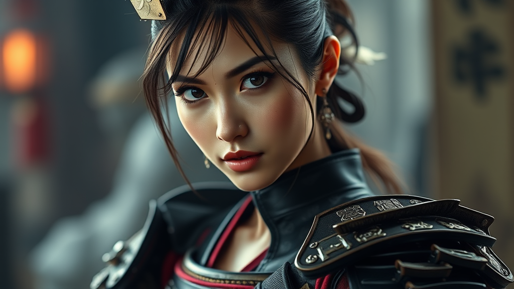 A stunning woman dressed in elegant samurai armor, exuding a captivating allure and engaging in playful flirtation as she gazes directly at the viewer, portrait-style, with an emphasis on her detailed, flawless skin. This photo-realistic scene captures her in 8k resolution with hyper-detailed, high-quality RAW color, showcasing intricate features and subtle piercings. The setting employs diffused, soft lighting with a shallow depth of field and sharp focus, enhancing her figure in full-length frame, all under cinematic lighting that heightens the sense of hyperrealism.