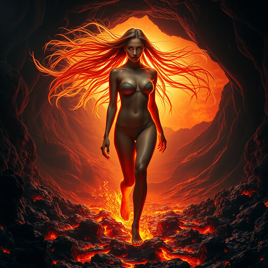A stunning woman emerges gracefully from the heart of a volcano, her form sculpted from molten lava, capturing an ethereal aura of raw beauty and strength reminiscent of a mythical goddess. Her flowing hair, like tendrils of fiery magma, cascades down her shoulders, shimmering with an incandescent glow. The heat from her presence casts a shimmering mirage around her, blending seamlessly with the volcanic landscape. Her eyes, glinting with the intensity of burning embers, gaze with a knowing intensity, drawing in the power and mystery of the earth's core. As she steps forward, lava cools and solidifies beneath her feet, leaving a trail of new terrain in her wake. The raw and visceral style of the composition highlights her connection to the primal forces of nature, embodying the very essence of creation and transformation.