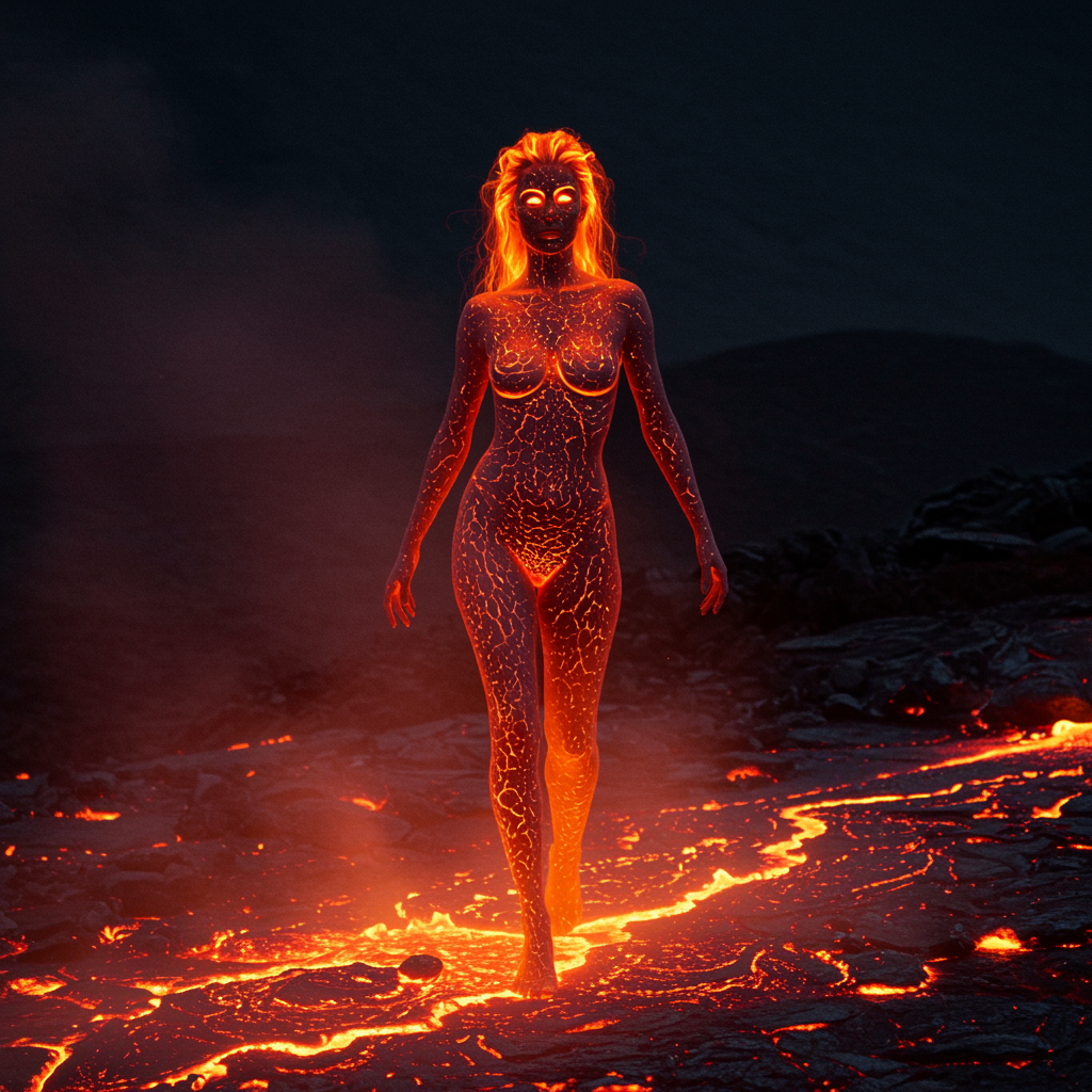 A stunning woman emerges gracefully from the heart of a volcano, her form sculpted from the very essence of molten lava. Her skin glows with the incandescent heat of freshly forged magma, casting an ethereal light in the surrounding darkness. Her hair flows like streams of fiery liquid, dancing with the energy of an eternal flame. Her eyes, like glowing embers, hold a wisdom as ancient as the earth itself. This transformation is both magnificent and raw, a testament to the profound beauty born from the chaotic forces of nature. As she steps forward, the ground cools and solidifies beneath her, leaving a trail of steaming obsidian in her wake.