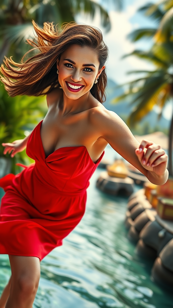 A stunning woman gracefully running through a paradise backdrop, exuding charm and confidence. She's dressed in glamorous attire, featuring a striking red dress, her smile bright and inviting as she makes eye contact with the viewer. The portrait captures her with detailed skin and a photo-realistic quality in 8k resolution. The scene is rich with details from high-resolution color art, utilizing soft diffused lighting and a shallow depth of field for sharp focus, emphasizing hyperrealism. It includes cinematic CGI lighting, illustrating a full-length image free from imperfections or distortions, ensuring natural proportions and flawlessly captured anatomy.