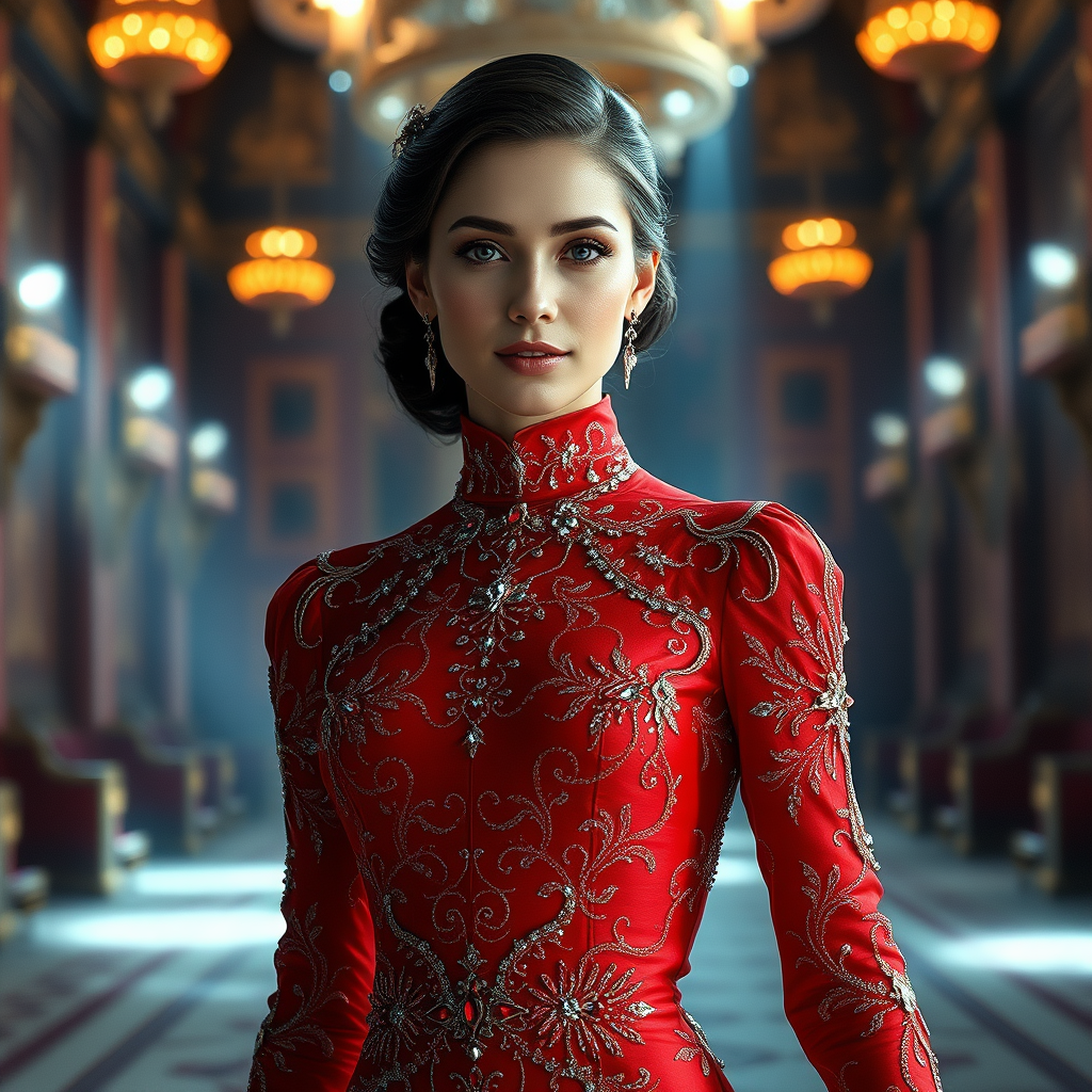 A stunning woman in a breathtaking red dress adorned with rubies and sparkling diamonds, showcasing intricate details and elegant craftsmanship. The dress, fashioned from the softest silk and exquisite brocade, highlights her beauty as she graces the fashion show runway. Set in a magnificent Sci-fi Victorian great hall, the dress features a sophisticated turtleneck design reminiscent of a bridal gown, capturing a timeless wedding photography essence. The full-body view reveals the dress's symmetrical artistry, brought to life with an ultra-realistic octane render. The scene is reminiscent of Peter Mohrbacher's masterpieces, illuminated by cinematic 8k and 4k lighting, with a focus on her captivating face, evoking an air of grace and wonder.