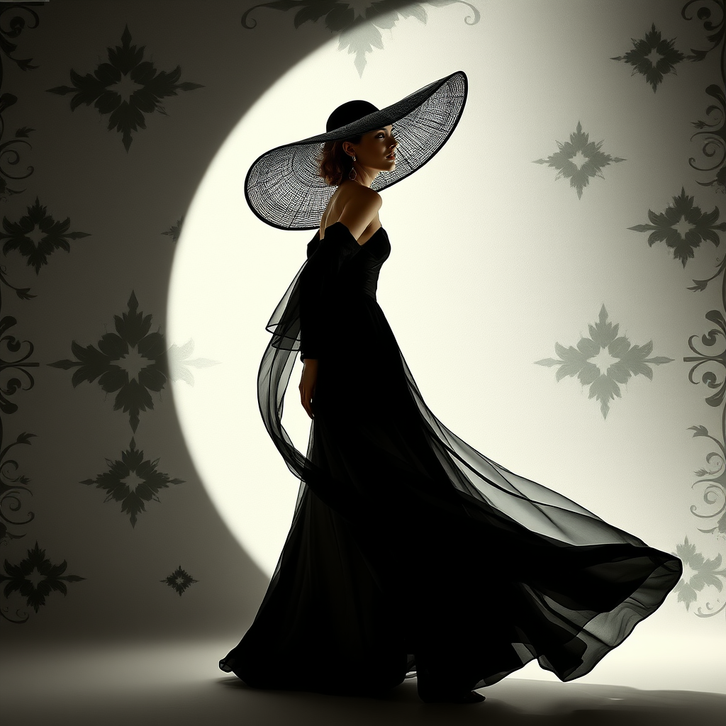 A stunning woman in a flowing black gown with an oversized hat tilted to the right, artfully blending into an enchanting composition of negative space, where light and shadow dance with crisp lines and intricate dark patterns, capturing an awe-inspiring beauty.