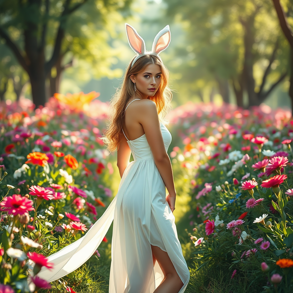 A stunning woman in a flowing white sundress adorned with delicate bunny ears stands gracefully amidst a vibrant floral landscape. Her attire gently hugs her figure, accentuating her silhouette against the backdrop of blooming flowers and lush greenery. The scene is reminiscent of a masterful painting, capturing the essence of serenity and natural beauty. Delicate sunlight filters through the trees, casting a soft glow that highlights her serene expression and the vivid colors around her. The artwork exudes an ethereal charm, inviting viewers into a whimsical blend of elegance and nature.