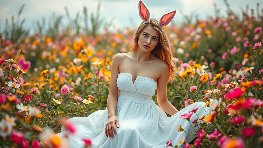 A stunning woman in a flowing white sundress adorned with gentle skindentation is nestled in a vibrant floral nature scene, her playful bunny ears adding a whimsical touch. The setting is reminiscent of a masterpiece painting, with a dreamy landscape of blooming flowers and lush greenery surrounding her. Though the concept embraces a hint of artistic imperfection, the overall composition captures an enchanting beauty, blending elegance and charm in a serene outdoor fantasy.