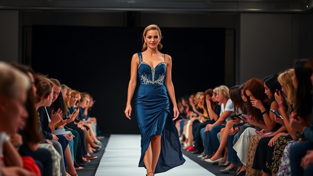 A stunning woman in a midnight blue dress adorned with silver accents gracefully walks down a runway, capturing the spotlight with her poise and elegance. Her presence commands the attention of an eager audience, where individuals closest to the runway lean forward in admiration, while those further back watch with anticipation. The woman's exquisite style combined with the enraptured crowd fosters an atmosphere of thrill and sophistication.
