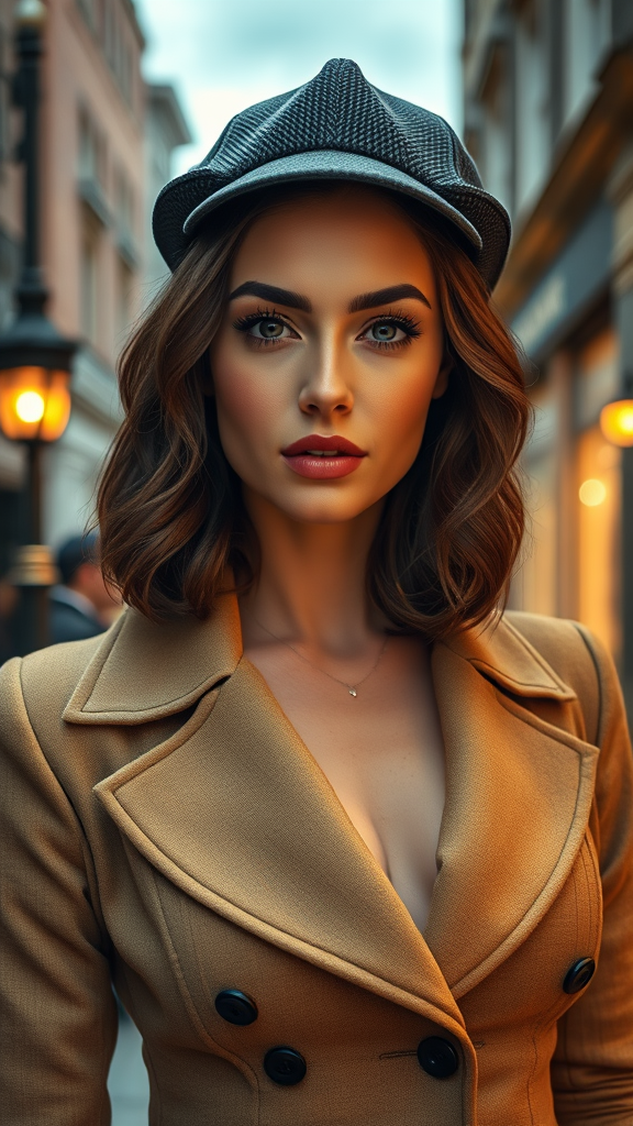 A stunning woman in a modern Sherlock Holmes-inspired outfit stands confidently on Baker Street, London. She exudes charm and allure, with a playful glint in her eyes as she gazes directly at the viewer. Captured in portrait orientation, the scene is a masterclass in realism, with every detail of her skin meticulously rendered. The full-length frame captures her entirely, set against a backdrop of cinematic lighting and soft, diffused illumination. The artwork showcases hyperrealistic detail, enhanced by a shallow depth of field and sharp focus, evoking a sense of 3D artistry with its intricate depiction. All imperfections are absent, ensuring a flawless representation free of any distortions, irregularities, or visual clutter.