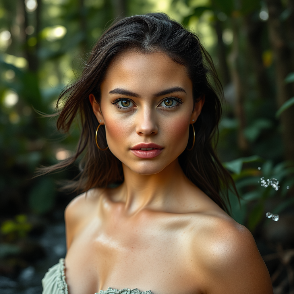 A stunning woman in a natural setting, captured in high-resolution 50mm portrait photography. Her eyes are striking and genuine, enhanced by cinematic lighting that highlights the fine details of her skin texture. She stands against a lush forest backdrop, with intricate elements in the scene. There's a dynamic splash of water that adds movement and life. Shot in ultra-sharp 8K resolution, the composition adheres to a 2:3 aspect ratio, showcasing the harmony between the subject and her wild surroundings.