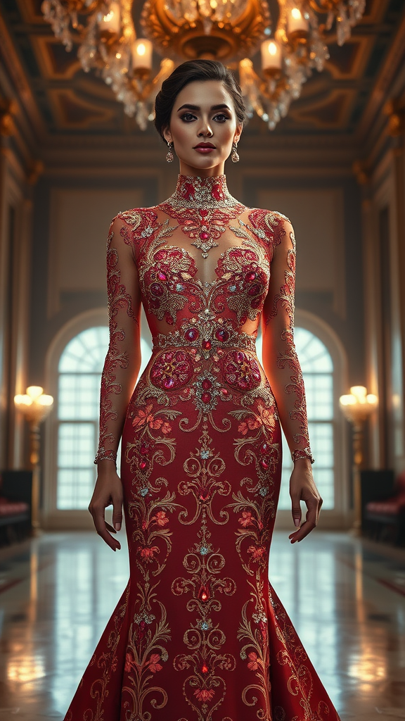 A stunning woman in a radiant dress embellished with glowing rubies and twinkling diamonds, showcasing intricate craftsmanship. This fashion masterpiece features a luxurious soft silk texture and opulent brocade patterns, set against the backdrop of a Sci-fi Victorian room. The scene unfolds in an expansive great hall where the gown seamlessly blends turtleneck elegance with bridal gown allure, perfect for wedding photography. The full-body portrayal captures the symmetrical beauty and sophistication of the dress in ultra-realistic, cinematic lighting. This work echoes the artistic vision of Peter Mohrbacher, rendered in exquisite 8k and 4k detail, evoking an atmosphere of timeless beauty and elegance.