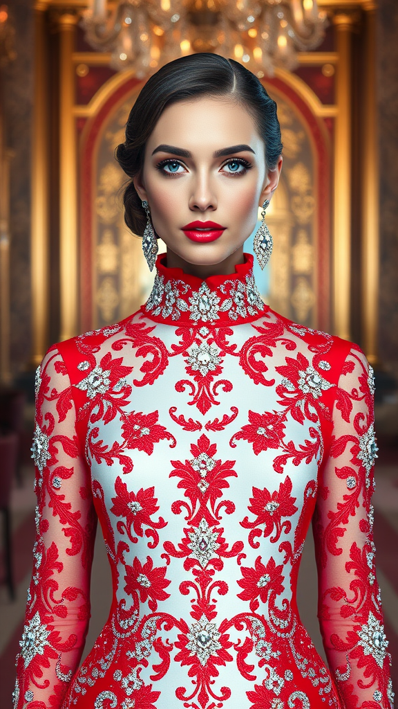 A stunning woman in a ruby-encrusted red dress adorned with shimmering diamonds in intricate patterns, blending soft silk with detailed brocade texture, poised for a fashion show. Her beauty is accentuated by the fashion-forward design, set within a Sci-fi Victorian great hall. The elegant turtleneck gown serves as an exquisite bridal piece, captured with a full-body focus. The symmetrical composition, inspired by Peter Mohrbacher, showcases ultra-realistic detail. Enhanced by cinematic 8k and 4k lighting, the scene exudes refinement and elegance, emphasizing the absence of hands or fingers for a flawless aesthetic.