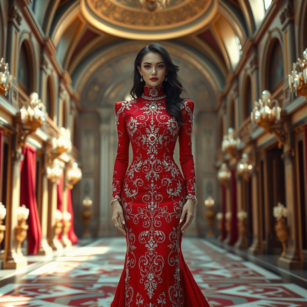 A stunning woman in a ruby red dress encrusted with sparkling diamonds, featuring intricate details and soft silk juxtaposed with luxurious brocade. She stands in a Sci-fi Victorian great hall, exuding elegance and sophistication. The turtleneck bridal gown emphasizes her beauty with its ultra-realistic, symmetrical design, capturing the essence of a fashion show. The scene is brought to life through cinematic lighting and an 8k resolution. Inspired by Peter Mohrbacher, the highly detailed rendering elevates the wedding photography setting to a new dimension, capturing her full-body presence without the distraction of hands or fingers.