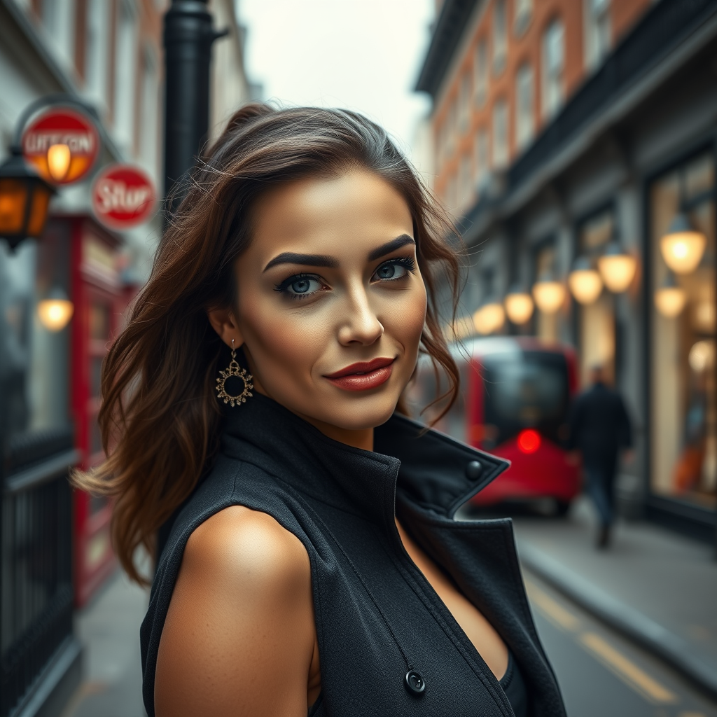 A stunning woman in a sleek Sherlock Holmes-inspired outfit stands confidently on London’s iconic Baker Street. Her charisma shines through as she playfully interacts with the viewer, exuding charm and allure. Captured in a portrait style, this high-resolution, 8k photo encapsulates hyper-realistic details, from her intricate skin texture to the subtle play of diffused soft light that highlights her features. The shallow depth of field and sharp focus emphasize her graceful presence in this cinematic, CGI-influenced composition.