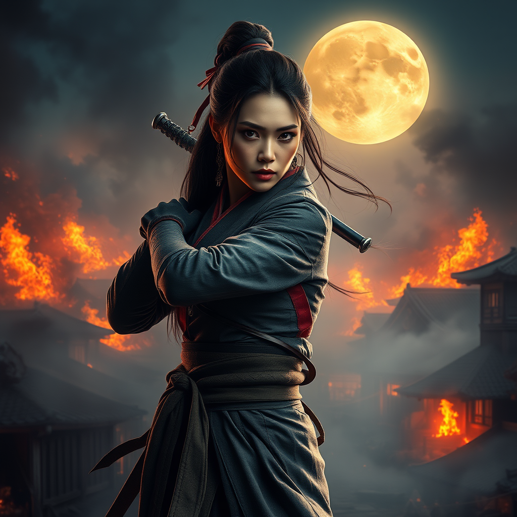 A stunning woman in an authentic ninja uniform stands with grace and power, her dynamic pose highlighting breathtaking beauty against the backdrop of a village consumed by flames and smoke. A full moon casts cinematic lighting over the scene, enhancing the volumetric fog that rises in the evening air. Every detail is meticulously crafted, with inspiration drawn from Artgerm and Anna Dittmann. Her expression is intense yet calm, embodying strength amidst chaos. As dusk settles, the surreal ambiance portrays both destruction and resilience. The artwork captures a comprehensive cinematic scene with added touches of realism, all while ensuring clarity and precision in her features and surroundings.
