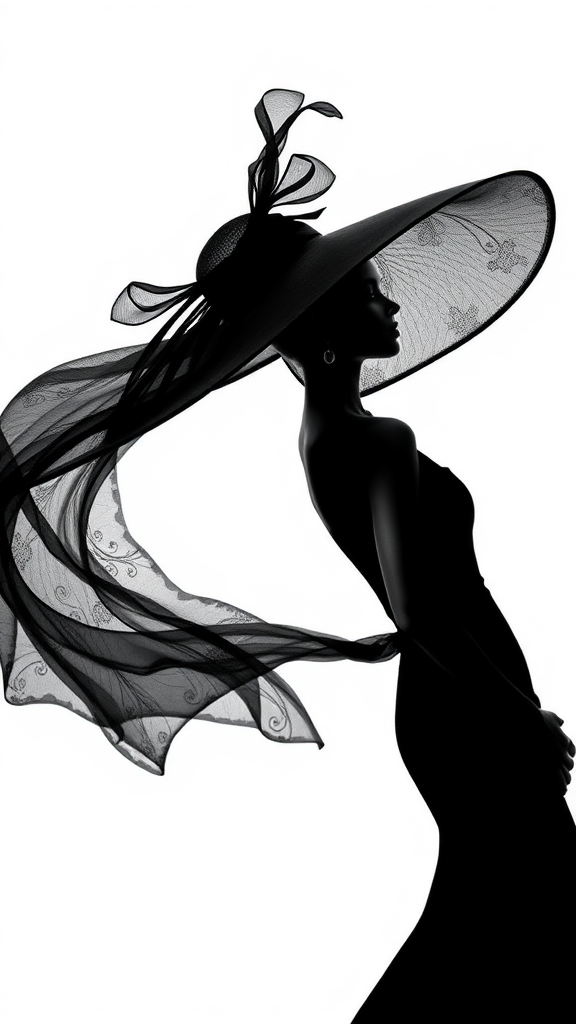 A stunning woman in an elegant black gown elegantly adorned with an oversized hat tilted to the right, her silhouette defined by masterful use of negative space, the interplay of light and shadow capturing her striking beauty, with crisp, fluid lines and intricately dark patterns adding depth and allure, a tableau that is both enigmatic and captivating.